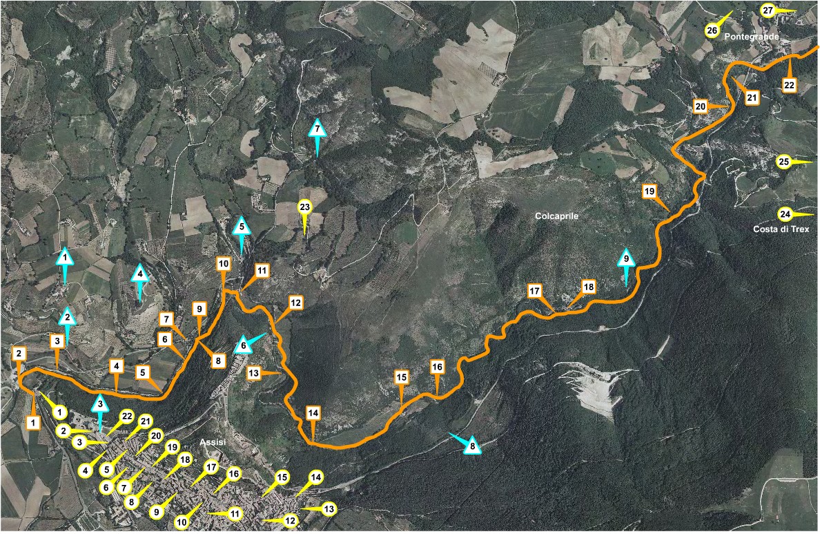 ![]() | 11. Ponte S.Croce o Ponte dei Galli IIlat. E 12°36'91.2 - lon. E 12°36´91.2 - alt. 285Il ponte a tre arcate è così denominato per la presenza dell’adiacente Chiesa di S.Croce. Viene chiamato – anche nei documenti - Ponte dei Galli come il suo omonimo più a valle ma più antico. Questo ponte fu costruito – in quanto il precedente era crollato - in questa forma tra il 1353 e il 1357 dai mastri Ritio Ciccoli e Vagnuccio Ugolini, probabilmente a seguito delle accresciute esigenze di viabilità sul sentiero francescano che collega Assisi con il monte La Verna. In aggiunta, non fu ininfluente la costruzione del monastero benedettino di S.Croce e l’adiacente ospedale e luogo di accoglienza. Sappiamo che fu restaurato alla fine del XV sec. Ma di nuovo crollato e ricostruito dal Comune di Assisi tra il 1948 e 1949. Accanto al ponte, ve n’è uno di epoca moderna che attraversa il Fosso della Genga, l’attraversamento di questo fosso doveva essere assolto in passato da due ponti più a monte nei pressi del Molino di Boccabuto. |