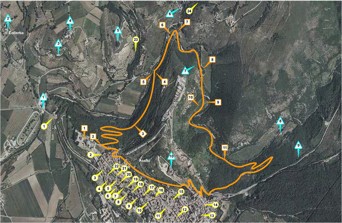 ![]() | 1. Basilica di S.Francescolat. E 12°36'22.1 - lon. E 12°36´22.1 - alt. 366Il percorso del Fai attraverso il Bosco di S.Francesco termina proprio nell´omonima basilica. La costruzione è iniziata il 17 luglio 1228 fuori della cinta muraria, sul <i>Collis Inferni</i> (Colle Inferno) che fino a quel momento risultava brullo perché adibito a pascolo. A dispetto delle numerose e lugubri leggende, il nome di Colle Inferno deriva da <i>Collis Inferior</i>, cioè il colle più in basso rispetto a quello su cui sorgeva l´Assisi originaria. Capolavoro del gotico italiano, dal 1230 conserva le spoglie di S.Francesco. Riccamente decorata (tra gli altri citiamo La vita di san Francesco negli affreschi attribuiti a Giotto), è composta di due chiese sovrapposte, la basilica inferiore e la basilica superiore, e dal complesso del monastero. Trovandosi la chiesa nella parte bassa della città, la distinzione tra basilica inferiore e superiore, ingenera spesso confusione nei visitatori che vanno a cercare la basilica superiore in un luogo più in alto di Assisi. Nel 1997, a seguito del terremoto, la basilica superiore ha subito notevoli danni (in grossa parte dovuti alle errate tecniche di restauro nella seconda metà del XX sec.). Fu necessario ricollocare circa 300.000 frammenti di affresco per resturare le volte cadute. L´opera si è conclusa nel 2006. |
